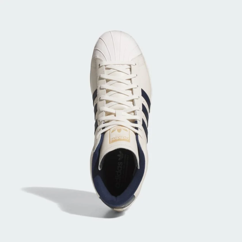 Men's Adidas Pro Model Midcut Spikeless Golf Shoes Importado de USA, estos zapatos combinan elegancia y comodidad con su diseño clásico y retro. Fabricados en cuero, destacan por sus rayas azules navy y su suela negra resistente. Ideales para quienes buscan un estilo versátil y sofisticado.