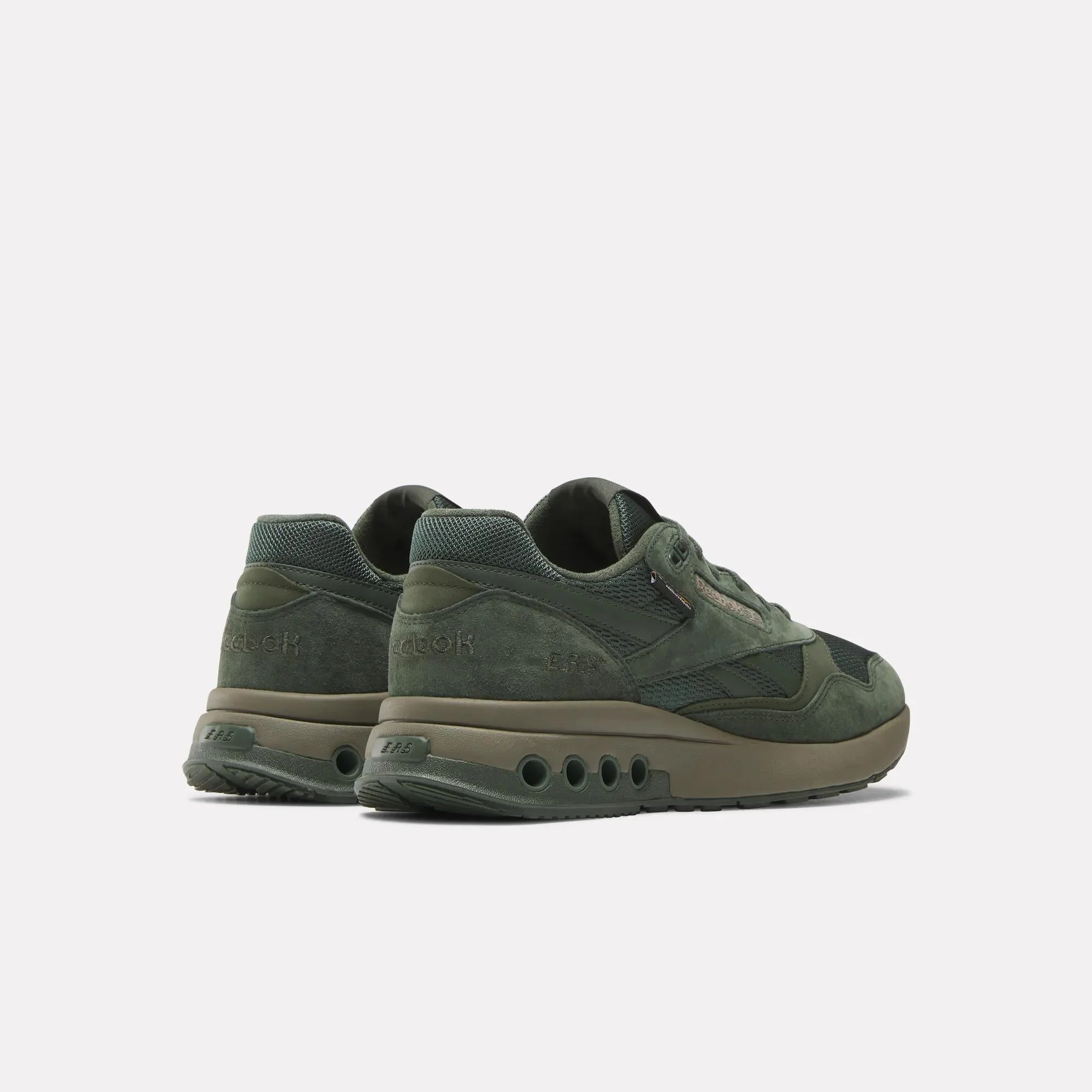 Zapatos Reebok Ers World en verde oscuro con detalles en blanco y textura en malla. El suela amortecida y el contraste en el talón le dan un toque moderno y deportivo. Ideal para looks casuales y versátiles.