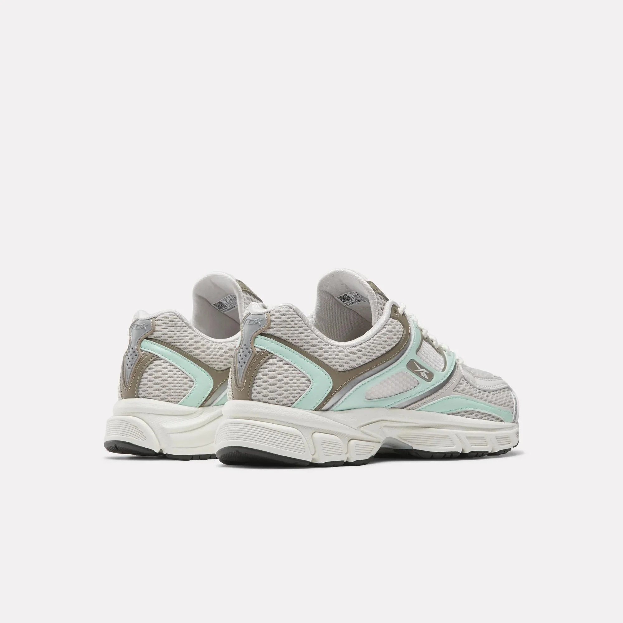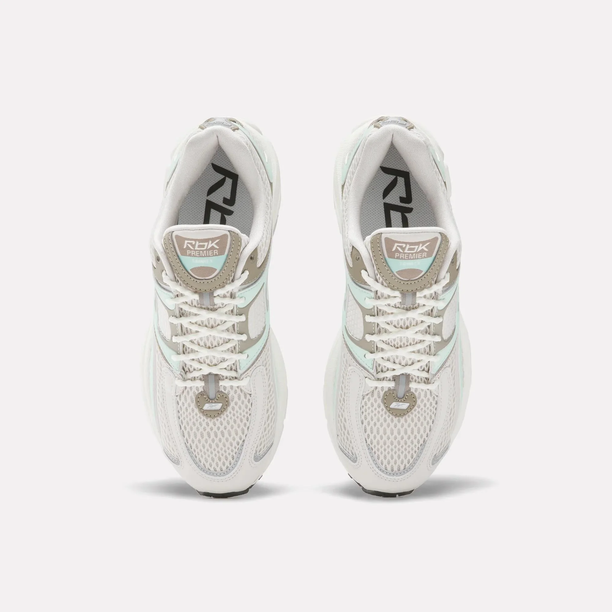 Reebok Premier Trinity, una zapatilla atletica en tonos gris claro y menta. Con combinación de materiales sintéticos y malla para una ventilación óptima. Diseño moderno y deportivo, ideal para looks casuales o actividades ligeras.
