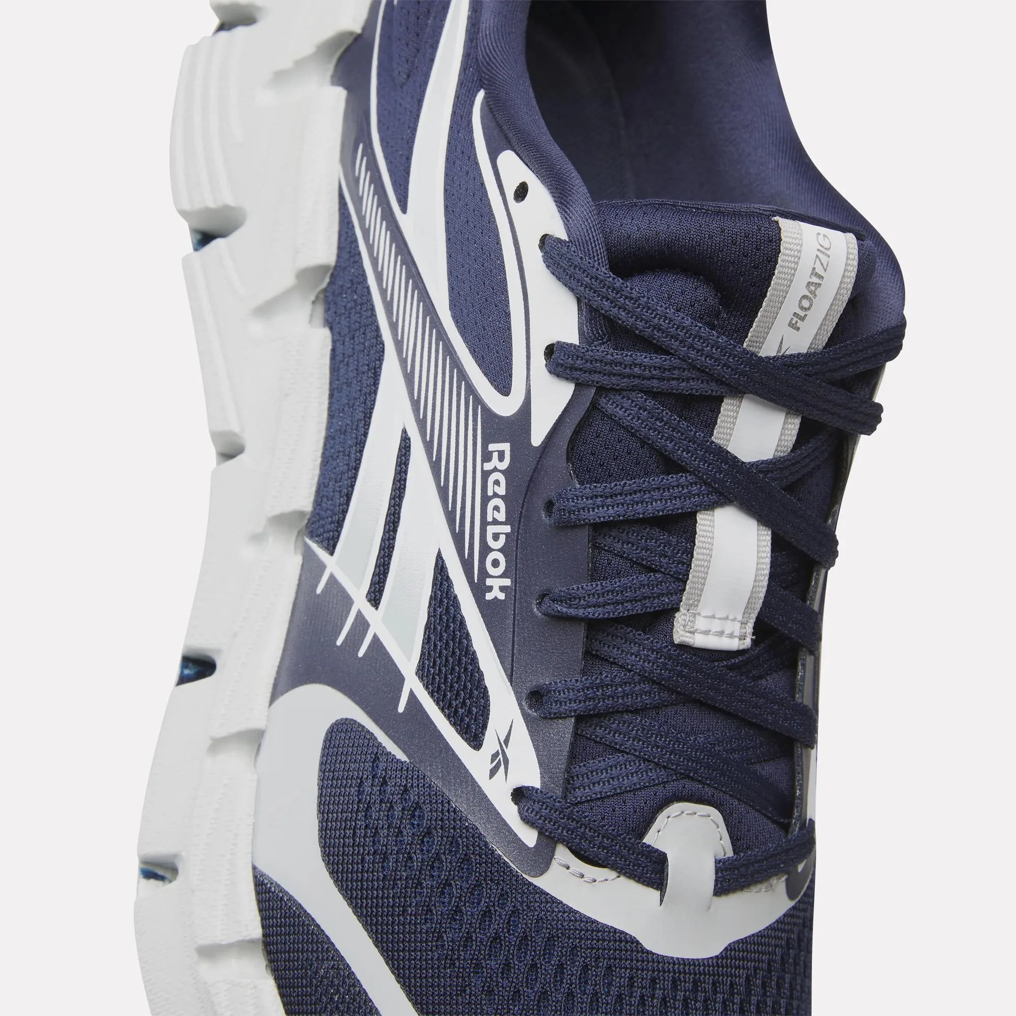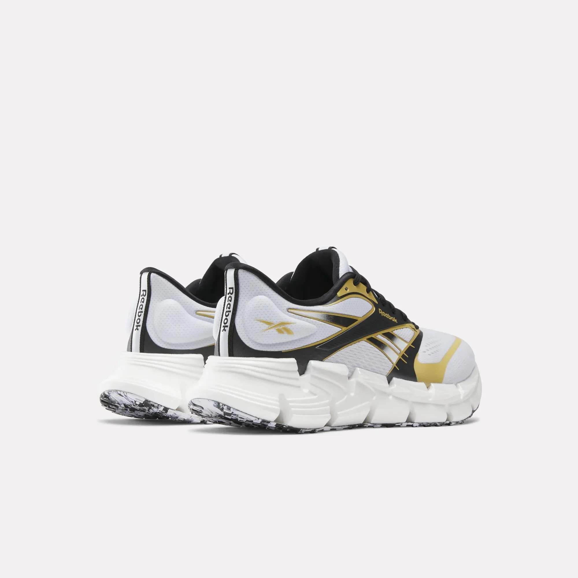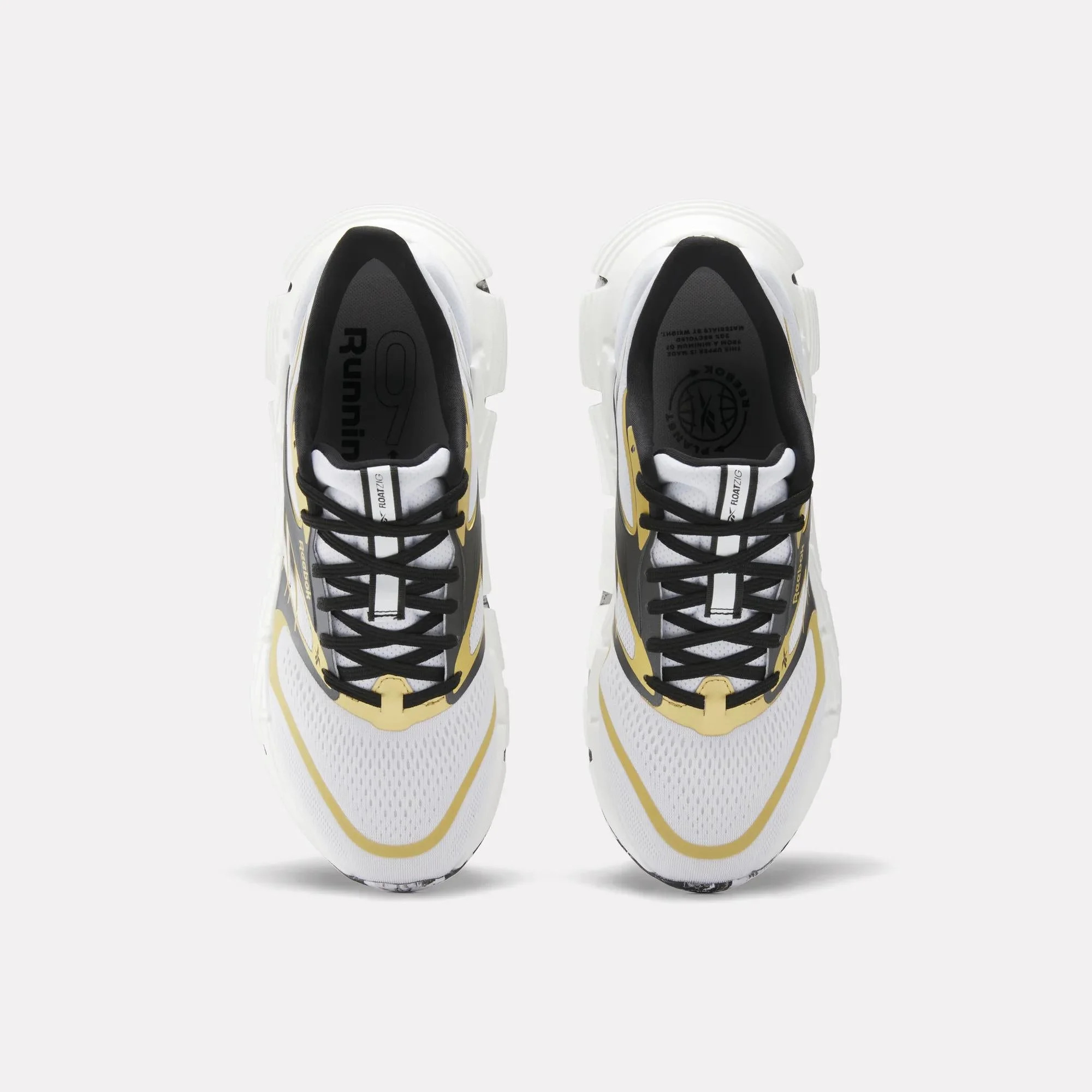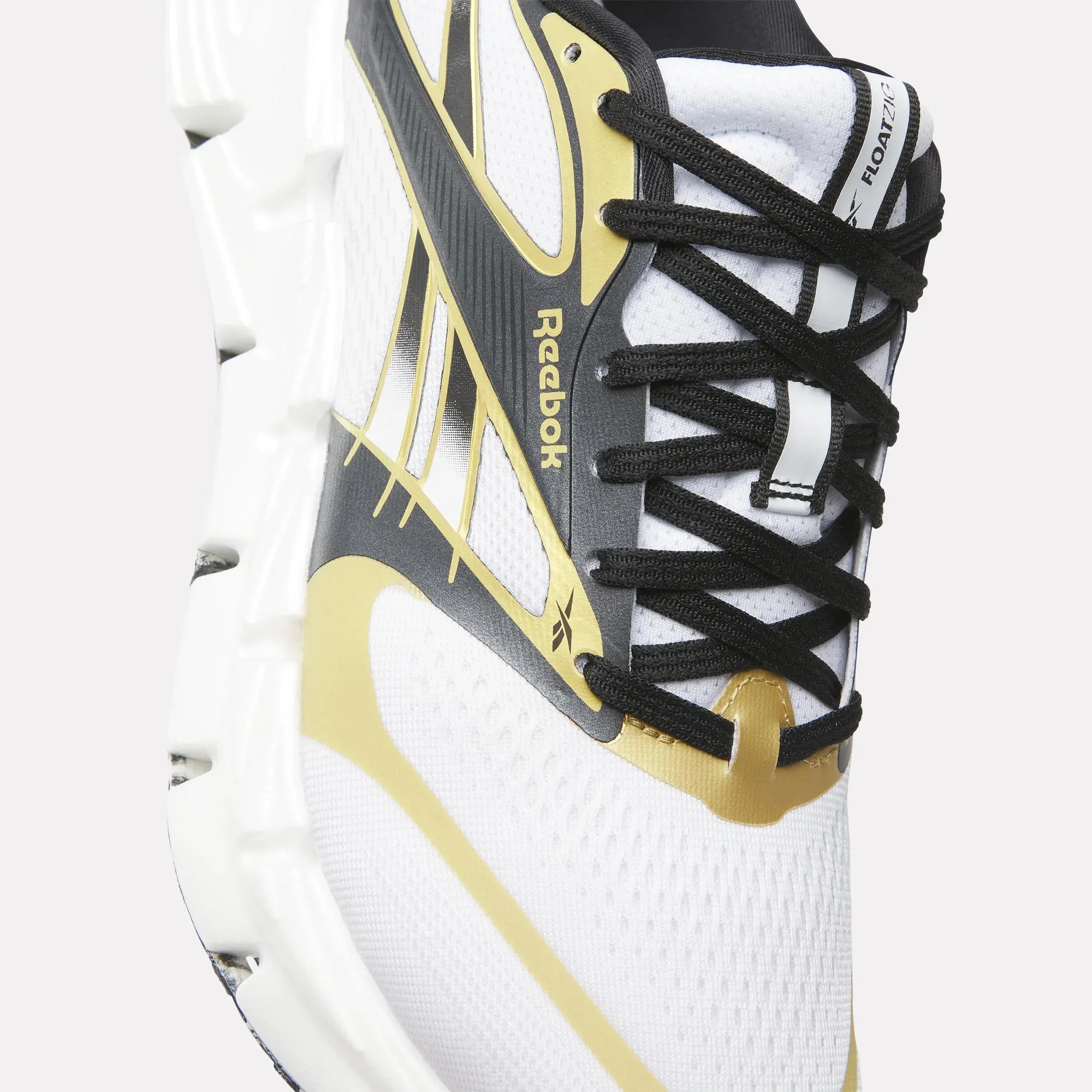 Zapatos de running Reebok Floatzig 2 en blanco y amarillo con detalles negros. Cuenta con una suela amortiguada y un upper transpirable hecho de malla, ideales para una experiencia cómoda y eficiente al correr. Diseñados para rendimiento y comodidad en cada paso.